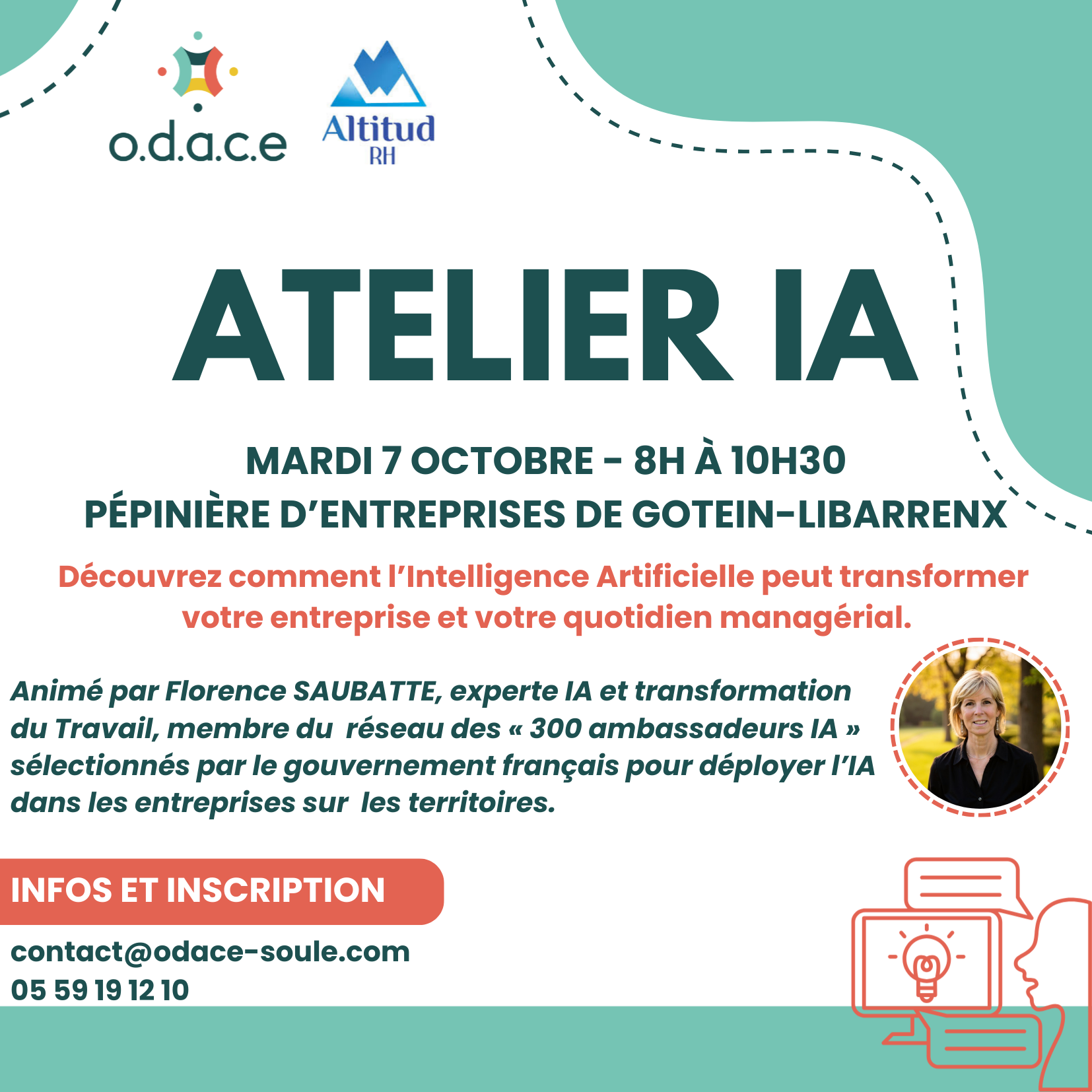 đą L’ODACE organise un atelier IA, animĂ© par Florence SAUBATTE, fondatrice d’Altitud RH, experte IA et transformation du Travail, membre du rĂ©seau des « 300 ambassadeurs IA » sĂ©lectionnĂ©s par le gouvernement français pour le plan national « Osez l’IA » afin de la dĂ©ployer dans les entreprises.