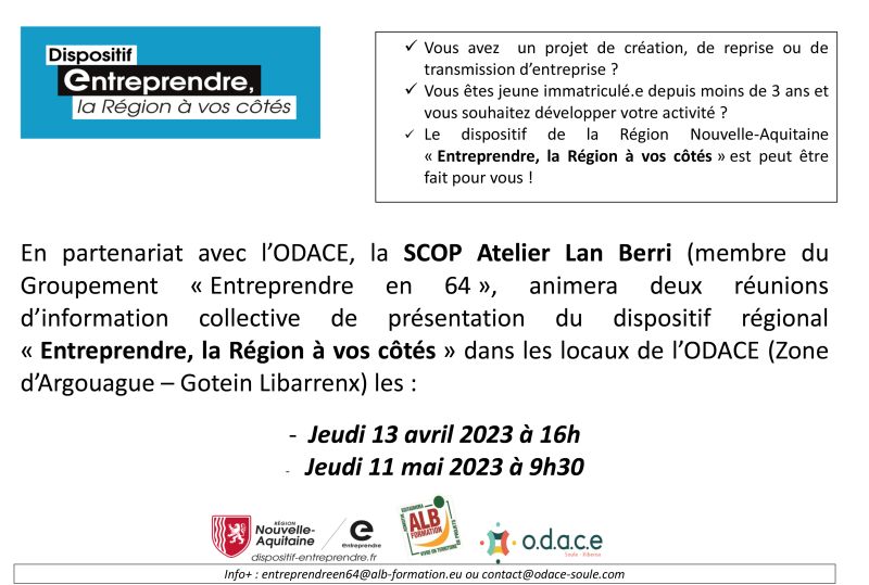 En partenariat avec l’ODACE, la SCOP Atelier Lan Berri (membre du Groupement «Entreprendre en 64»), animera deux réunions d’information collective de présentation du dispositif régional «Entreprendre, la Région à vos côtés» dans les locaux de l’ODACE (Zone d’Argouague – Gotein Libarrenx) les: