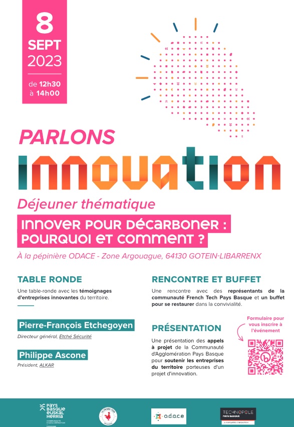 A la rentrée 2023, la Communauté d’Agglomération Pays Basque relance, en collaboration avec l’ODACE, l’opération « Parlons innovation », avec un rendez-vous à la pépinière de Gotein-Libarrenx le 8 septembre de 12h30 à 14h avec le déjeuner thématique « Innover pour décarboner : pourquoi et comment ? ».