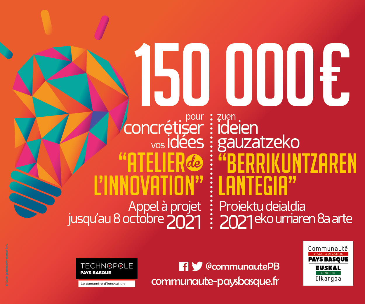 L’Atelier de l’innovation pour 2021 Maïlys 1 octobre 2021 Vie économique 0 0 Comments L’Atelier de l’innovation 2021 est lancé ! Vous êtes une entreprise de moins de 20 salariés, installée au Pays Basque, et porteuse d’un projet innovant ? Candidatez à l’appel à projet Atelier de l’Innovation pour concrétiser votre idée ! Pour la 9ème édition, la Communauté Pays Basque consacre une enveloppe de 150 000€ pour soutenir les entreprises innovantes du territoire. Les lauréats bénéficieront également d’un accompagnement par Technopole Pays Basque et d’une belle visibilité. Clôture des candidatures : 8 octobre 2021 à minuit Informations et documents utiles : ici !