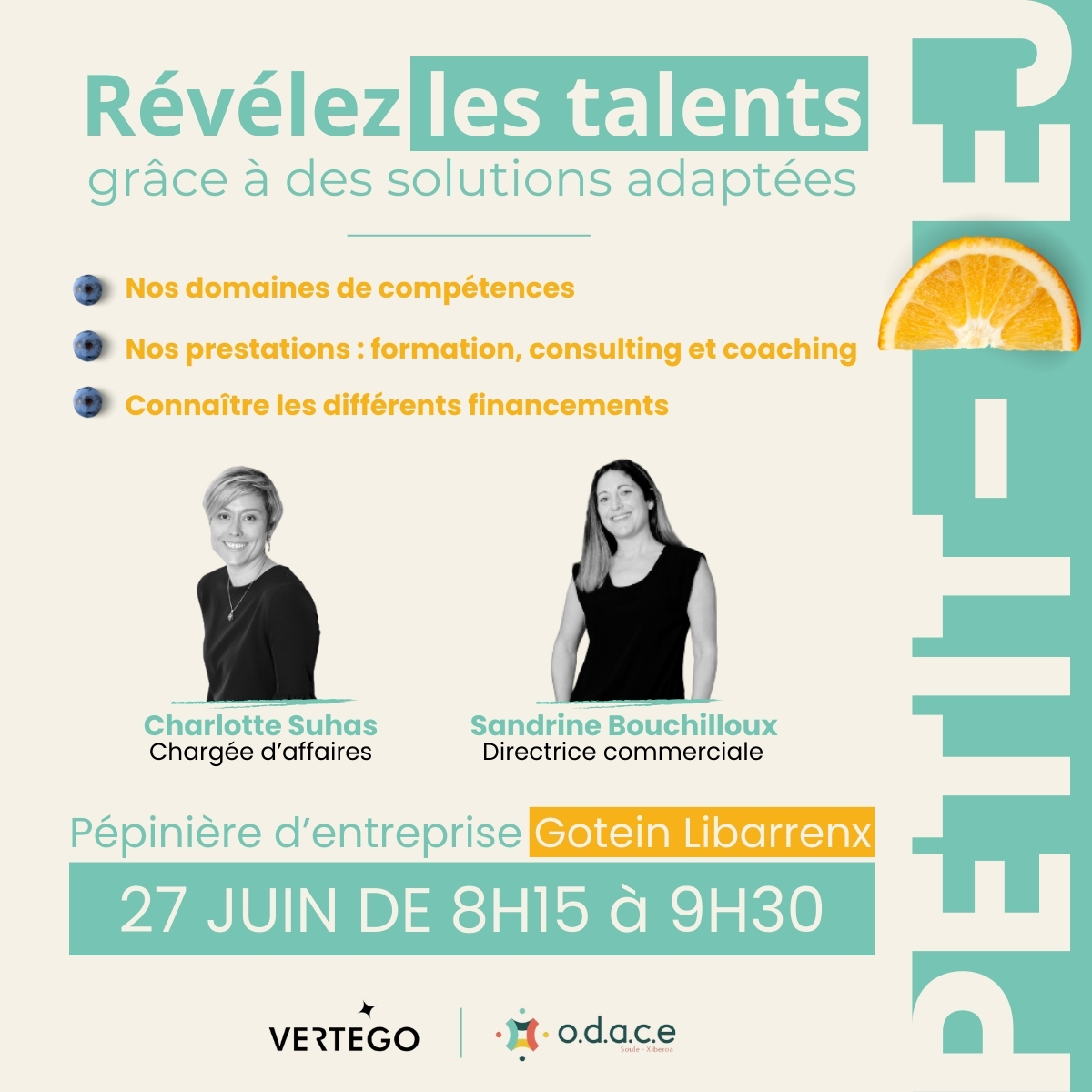 L’ODACE vous propose de rencontrer le centre de formation VERTEGO lors d’un petit déjeuner le 27 juin de 8h15 à 9h30 à la pépinière de Gotein-Libarrenx.