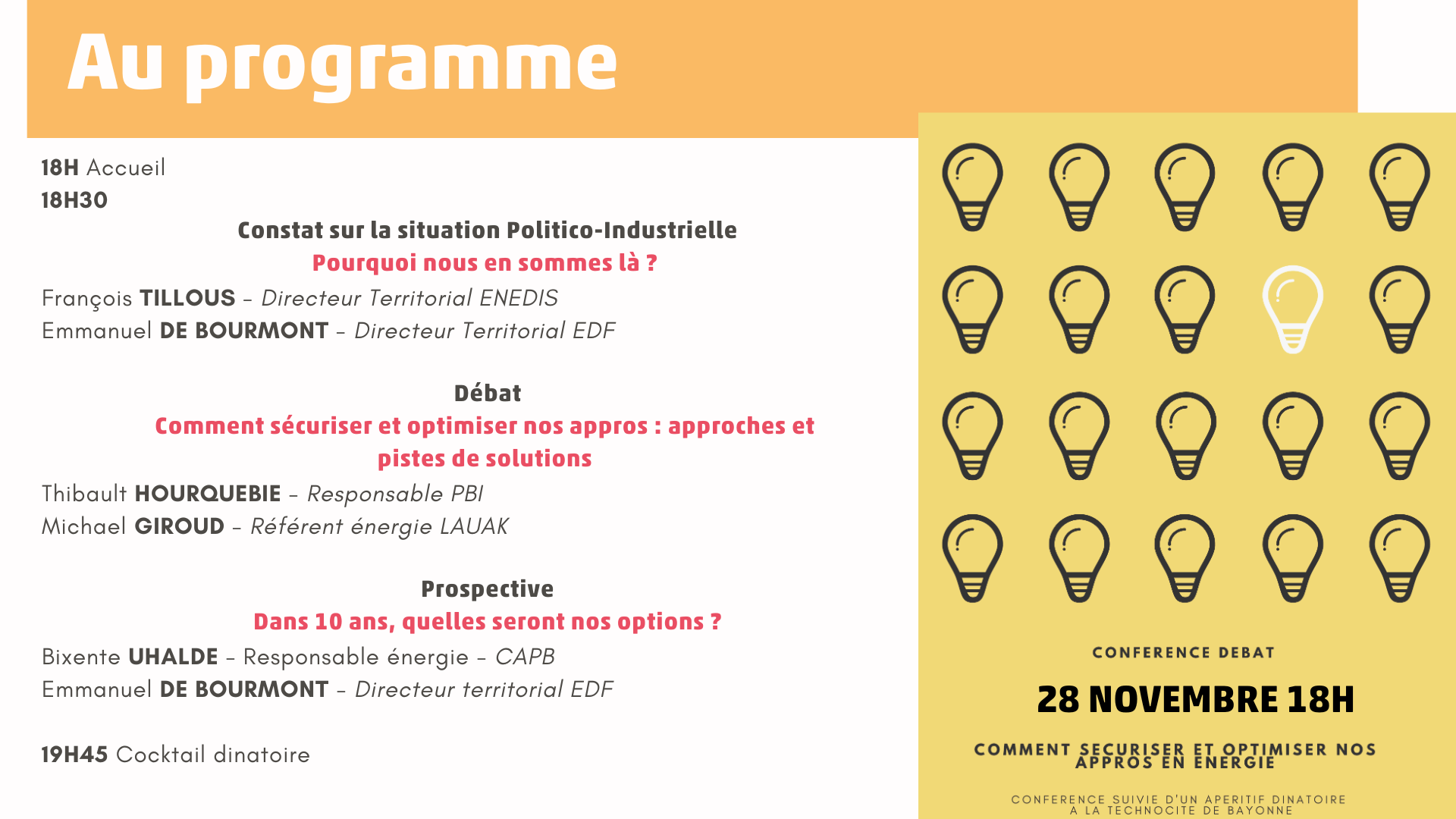 Réseau Entreprendre Adour et Pays Basque Industries s’associent et proposent aux entreprises une soirée conférence le 28 novembre à 18h à la Technocité à Bayonne avec le thème « Constats et réflexions sur l’approvisionnement d’énergie dans nos entreprises ».