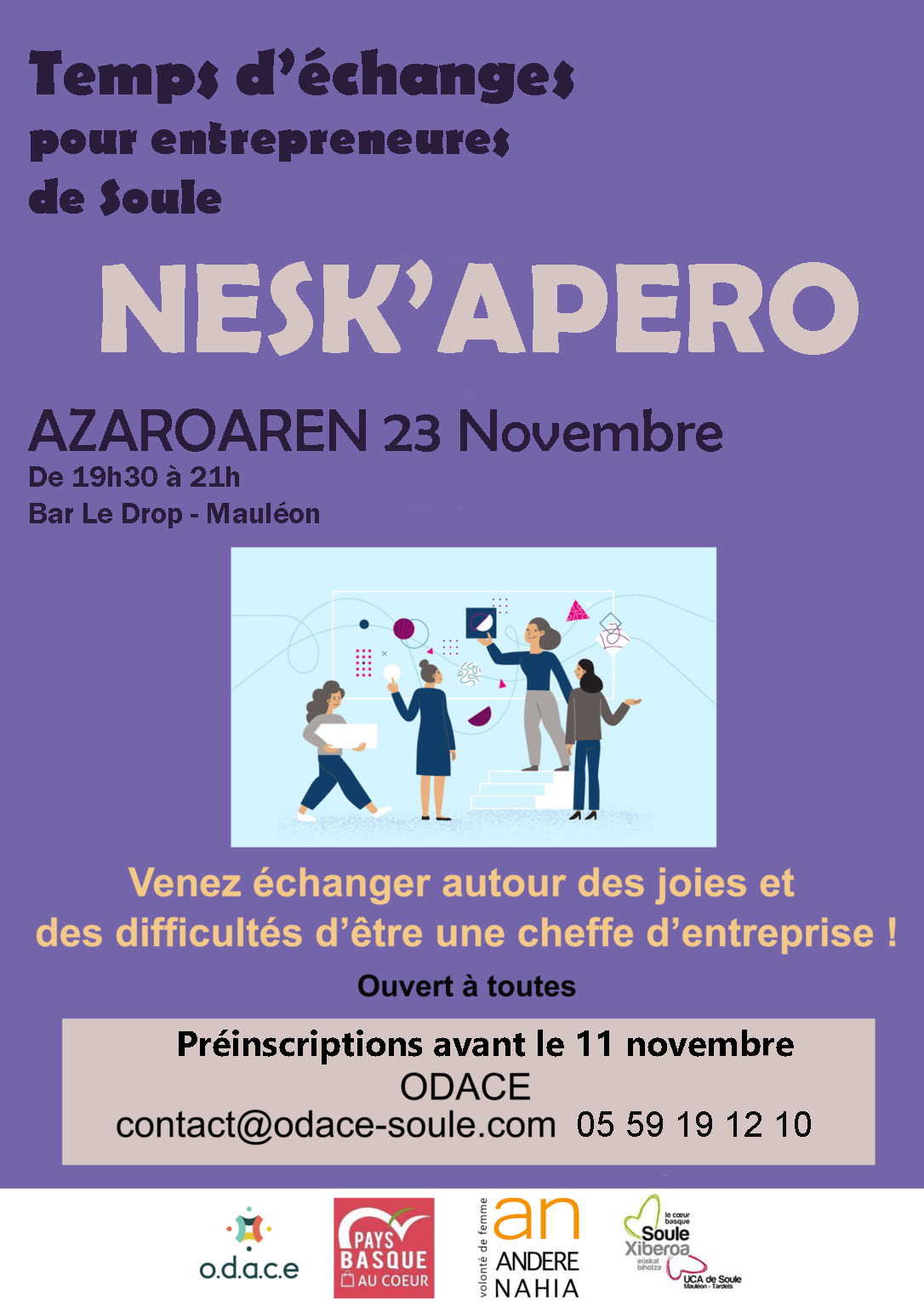 Le Jeudi 23 Novembre, l’ODACE, l’Union Commerciale et Artisanale de Soule, Pays Basque Au Coeur et Andere Nahia organisent un NESK’APERO au bar Le Drop à Mauléon de 19h30 à 21h.